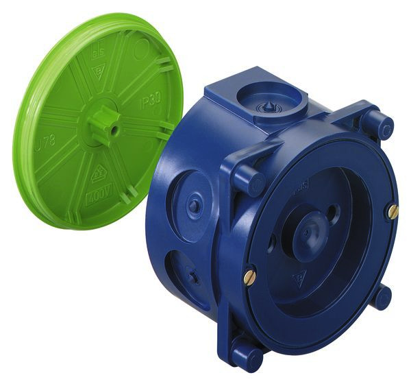 Schraubabstand 67 mm, für Perilex®-Einsätze 16 A, FR-UP-Geräte, CEE-Steckdosen 5-polig 16A, geeignet für Gegenschalung und Magnetbefestigung Gerätedose, Schraubabstand 67mm, für Perilex(R)-Einsätze 16 A, FR-UP-Geräte, CEE-Steckdosen 5-polig 16 A, mit Schutzart IP30, Bemessungsisolationsspannung: 400V AC, halogenfrei, 2-teilig, Magnet- oder Nagelbefestigung, Membran zur Lochung, Dichtbereich M16-M25, stützholmfähig
