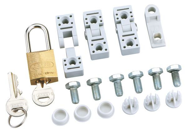 zum Umrüsten des Gehäusedeckels zur abschließbaren Klapptür, inkl. Vorhängeschloss, 2 Scharniere, Befestigungsschrauben, Abdeckstopfen und Bohrschablone
