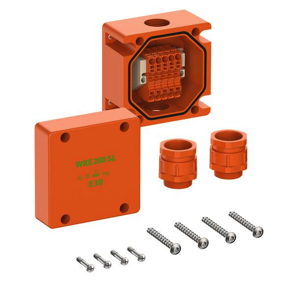 Abzweigkasten, mit Schutzart IP66, Ui=450 V AC, zertifiziert durch VDE (DIN EN 60670-1/-22 (VDE 0606-1/-22)), Innengewinde, M32, (2 seitlich), außenliegende Befestigungsstellen, mit elektrischem Funktionserhalt E30 nach DIN 4102 Teil 12, mit schraubenlosen Reihenklemmen Wago TopJobS, Gehäuse aus halogenfreiem Spezialduroplast, orange, Verbindungskasten 5-polig, Klemmvermögen pro Pol 2 x 0,5-6mm²