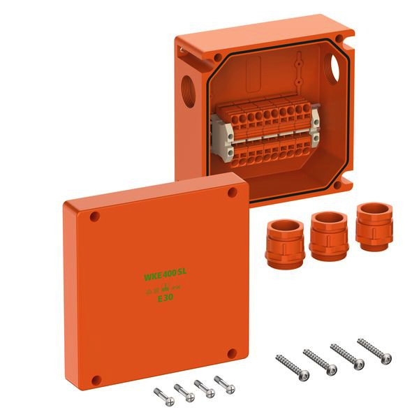 Abzweigkasten, mit Schutzart IP66, Ui=450 V AC, zertifiziert durch VDE (DIN EN 60670-1/-22 (VDE 0606-1/-22)), Innengewinde, M32/M40, (3 seitlich), außenliegende Befestigungsstellen, mit elektrischem Funktionserhalt E30 nach DIN 4102 Teil 12, mit schraubenlosen Reihenklemmen Wago TopJobS, Gehäuse aus halogenfreiem Spezialduroplast, orange, Abzweigkasten 5-polig, Klemmvermögen pro Pol 4 x 0,5-16mm²
