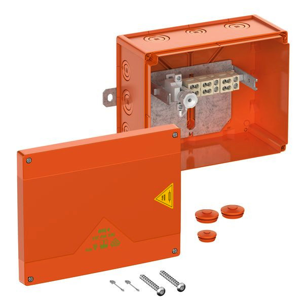 Abzweigkasten, mit Schutzart IP66, Ui=450 V AC, zertifiziert durch UL-EU (EN 62208), UL-EU (EN 61439-1/-2), M20/M25/M32/M40, (4 rückseitig, 12 seitlich), außenliegende Befestigungsstellen, mit elektrischem Funktionserhalt E30-E90 nach DIN 4102 Teil 12. Halogenfreies Gehäuse aus Spezialthermoplast, Klemmen aus hochtemperaturbeständiger Spezialkeramik, Klemmenhalter frei positionierbar, orange, Verbindungskasten 5-polig 1,5-10mm², Abzweigkasten 3-polig 1,5-10mm², Sicherung im Abzweig 1 x Sockel D01 (ohne Einsatz), Anzahl der klemmbaren Leiter pro Klemmstelle 4 x 1,5² / 3 x 2,5² / 2 x 4² / 1 x 6² / 1 x 10²