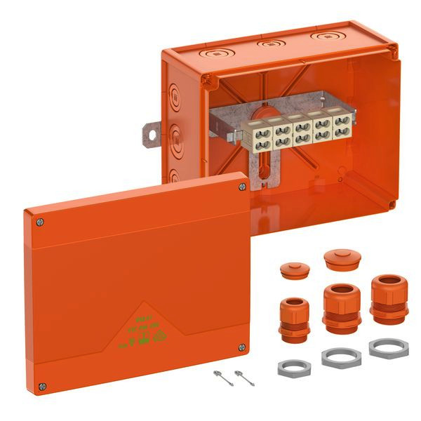 Abzweigkasten, mit Schutzart IP66, Ui=450 V AC, zertifiziert durch VDE (DIN EN 60670-1/-22 (VDE 0606-1/-22)), UL-EU (EN 62208), Ausschlagmembranen, M20/M25/M32/M40, (4 rückseitig, 12 seitlich), außenliegende Befestigungsstellen, mit elektrischem Funktionserhalt E30-E90 nach DIN 4102 Teil 12. Druck-Sog-Dicht gemäß Gotthard-Richtlinie. Halogenfreies Gehäuse aus Spezialthermoplast, Klemmen aus hochtemperaturbeständiger Spezialkeramik, Klemmenhalter frei positionierbar, Schnellmontage durch Außenbefestigungslaschen aus Edelstahl 1.4571. Deckelschrauben aus Edelstahl 1.4578, orange, Verbindungskasten 5-polig 1,5-16mm², Abzweigkasten 5-polig 1,5-16mm², Anzahl der klemmbaren Leiter pro Pol: 20 x 1,5² / 16 x 2,5² / 12 x 4² / 8 x 6² / 4 x 10² / 4 x 16²