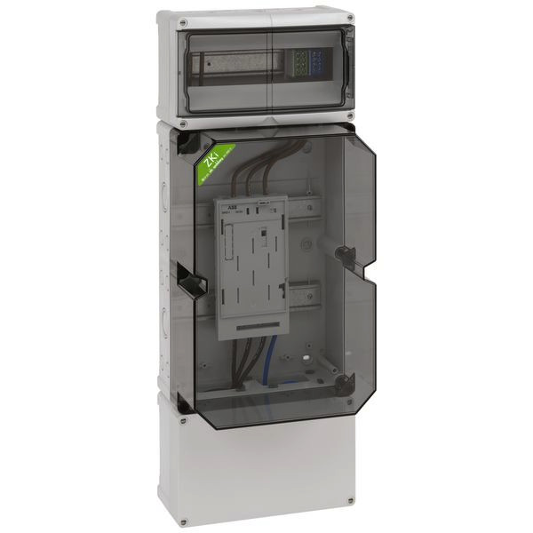 mit transparentem Deckel, serienmäßig plombierbar, mit montierter BKE-I für den elektronischen Haushaltszähler, serienmäßig plombierbarer Konsumentenraum oben, mit 35 mm Normschiene und PE/N-Doppelklemmen, serienmäßig plombierbarer Konsumentenraum unten, mit 35 mm Normschiene und 5-poliger HA-Klemme 25/16 mm², mit IP54 Anbaustutzen, Verschluss- und Isolierstopfen