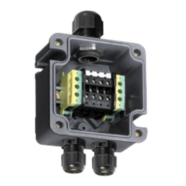 Klemmenkasten Ex e, 690 V, 1x WAGO 264-727/999-950, 3x WAGO 264-220, 2x M20 x 1,5 Kabelverschraubung Polyamid, schwarz, 1x M20 x 1,5 Verschlussstopfen Polyamid, 1x Tragschiene 15 x 70 mm, Zone 1/2/21/22