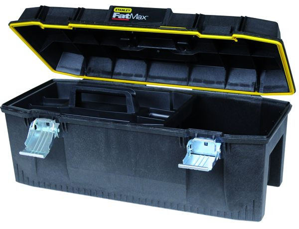 28 Zoll Werkzeugbox Structural Foam / FatMax Werkzeugbox in 23 oder 28 erhältlich / professionelle Werkzeugbox mit 32 Liter Volumen (28 Version) / Dichtigkeit IP53 / Schutz vor Staubablagerung und gegen fallendes Sprühwasser bis 60° gegen die Senkrechte / rundum laufende Gummiabdichtung für optimalen Schutz des Inhalts / Vertiefung im Deckel zum Einlegen und Bearbeiten von Werkstücken / mit herausnehmbarer Trage für Werkzeuge und Zubehör / robuster und großer Griff mit Weichstoffeinlagen / seitliche Aussparungen für sicheren Griff beim Transport / große rostfreie Metallschließen mit Aussparungen für Vorhängeschloss / 28 Box passend für Sägen bis zu 66 cm (26 ) und Wasserwaagen bis zu 61 cm (24 )