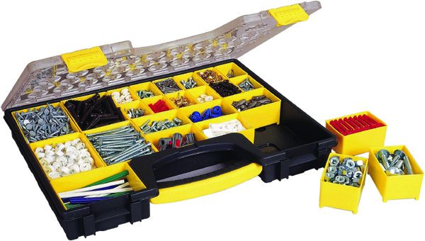 ohne Inhalt Profi-Organizer 25 Fächer / herausnehmbare Boxen in drei verschiedenen Größen / unzerbrechlicher hochtransparenter Polycarbonat-Deckel / Spezial-Deckel fixiert die Boxen, auch wenn einige entnommen sind