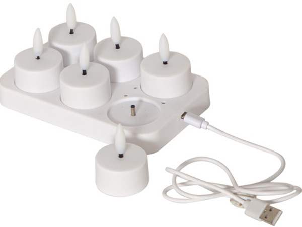 Flamme Charge ist ein Set von 6 wiederaufladbaren weißen Teelichtern (4x5cm). Die dazugehörige Ladeplatte verfügt über ein 80cm langes Kabel mit USB A-USB C-Steckern, das einfach an einen 5V-Adapter angeschlossen werden kann (Adapter nicht im Lieferumfang enthalten). Während des Ladevorgangs leuchtet die Kontrollleuchte in jeder Kerze rot und grün, um anzuzeigen, wann das T-Light vollständig geladen ist. Obwohl die Lithiumbatterien über einen Überladungsschutz verfügen, sollten Sie die Kerzen maximal 10 Stunden aufladen. Im Neuzustand reichen 5 Stunden Aufladezeit aus.