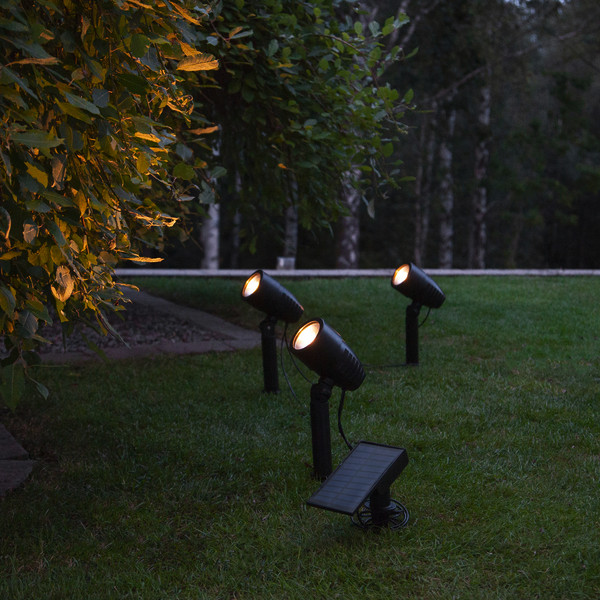 LED Solar Erspieß Strahler, 3er Set schwarz, zwischen den Strahler je 1mtr. Kabel, 2mtr. Kabel bis zum Solarpanel, LxBxH: 8x14,5x26cm, inkl. 3x LED 0,03W 3000K