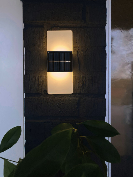 LED Solar Wandleuchte, mattierte Abdeckung, IP44 mit Dämmerungssensor, LxBxH: 8x3x20cm, inkl. 2x LED 0,30W warmweiß und Tageslichtweiß