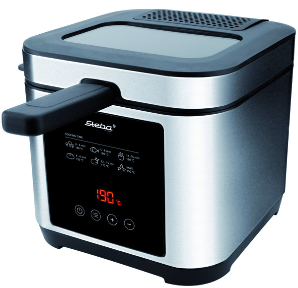 Edelstahlgehäuse, abnehmbarer Deckel mit XXL-Sichtfenster und Dauerfilter, Korbgröße 9 x 17 x 15,5 cm, Digital-Display, stufenloser Temperaturregler bis 190° C, Timer 20 bis 120 Min.