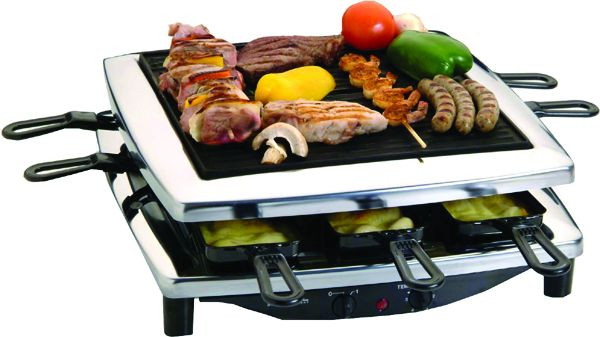 wendbare, emaillierte Stahlguss-Grillplatte (geriffelt/glatt) und Naturstein-Grillplatte, (je ca. 26 x 26 cm), emaillierte Pfännchen, stufenlose Temperaturregelung, Ein-/Ausschalter mit Kontrollleuchte, Made in Germany