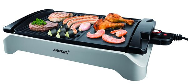 antihaftbeschichtete Alu-Druckgussplatte mit glattem Bereich für Würste, Meeresfrüchte usw. und mit Grillmuster für Steaks oder Fisch, integriertes Heizelement, Fettablauf mit integrierter Auffangschale, Temperaturkontrollleuchte