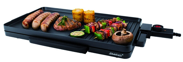 ultra-flach, antihaftbeschichtete Grillplatte mit integriertem Heizelement, Low-Fat: Bratflu¨ssigkeit la¨uft in eine Auffangschale ab, stufenlose Temperaturregelung, Temperaturkontrollleuchte