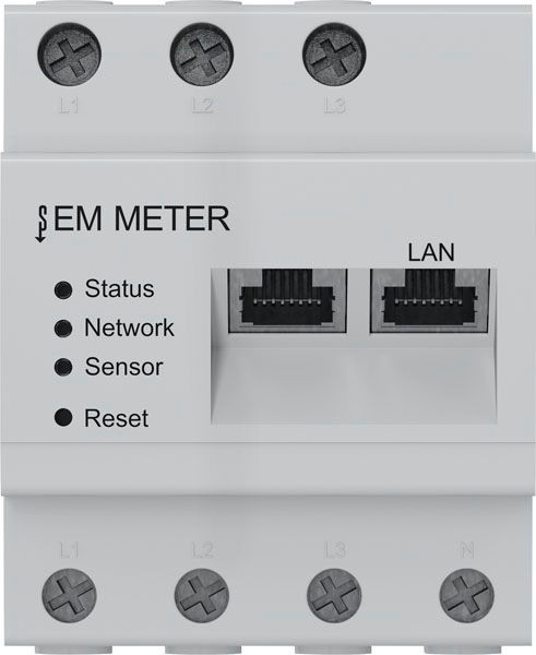 Beschreibung • Der EM Meter optimiert in Kombination mit der Energiemanagement-Software EM Trend die Stromnutzung aus einer Photovoltaik-Anlage für den Betrieb einer Wärmepumpe. • Der EM Meter misst die elektrische Einspeise- oder Netzbezugsleistung am Netzanschluss eines Gebäudes in Echtzeit. Die Daten werden über Ethernet und das Hausnetzwerk an EM Trend übertragen. • Für die Montage werden vier Teilungseinheiten auf der Hutschiene im Verteilerkasten benötigt. • Die Strombelastbarkeit beträgt 63 A.