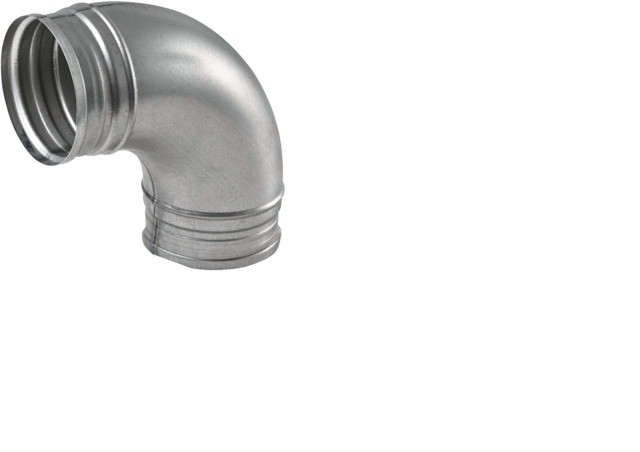 Beschreibung • 90° Bogen aus verzinktem Stahlblech in Ausführung DN 75. Kurze Umlenkungen des LVS-Rohrs und dadurch platzsparende Installation werden durch das geringe Aufbaumaß ermöglicht. Fester Sitz und sicherer Halt des Bogens im Rohr durch die integrierten Klammern.