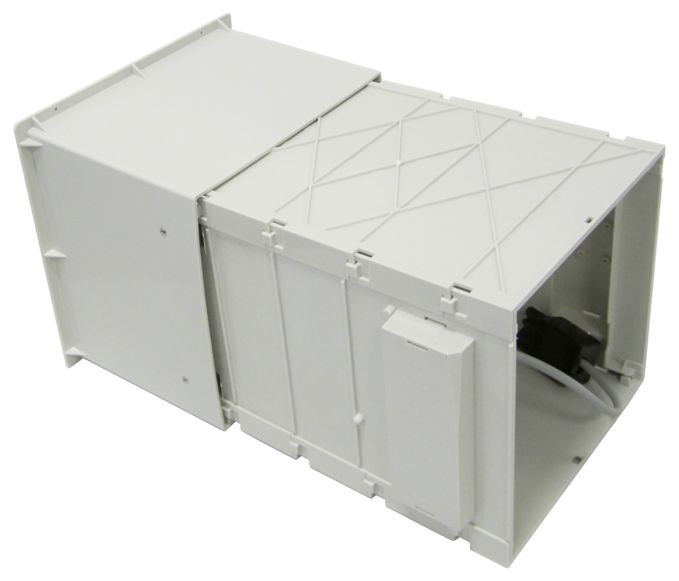 Beschreibung • Das Teleskopgehäuse aus Kunststoff eignet sich für die Montage des dezentralen Lüftungsgerätes. Es kann auf die Mauerstärke angepasst werden.