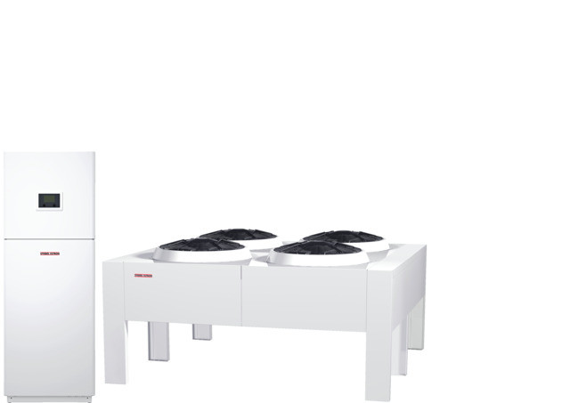 Anwendung • Luft-Wasser-Wärmepumpe in Split-Ausführung: Die Verdampfereinheit wird im Außenbereich oder auf einem Flachdach platziert, das Kältemodul im Gebäude aufgestellt. Das Gerät ist wegen der geringen Schallemissionen ideal für enge Bebauungen geeignet. Dank der bedarfsgerecht hohen Vorlauftemperaturen eignet sich die Wärmepumpe für den Einsatz in Mehrfamilienhäusern und Gewerbebauten. • Die Wärmepumpe ist für den Heiz- und Warmwasserbetrieb geeignet, kann aber auch zur effizienten Kühlung durch Kreislaufumkehr genutzt werden. Komfortmerkmale • Leiser Betrieb: Der Verdichter im Innengerät vermeidet die typischen Verdichtergeräusche im Außenbereich. Für den niedrigen Schallleistungspegel sind auch der modulierende Lüfter und die horizontale Bauform des Verdampfers verantwortlich, die zur primären Schallausbreitung nach oben beiträgt. • Der integrierte Wärmepumpen-Manager übernimmt die vollautomatische Regelung der Heizungsanlage abhängig von der Außentemperatur. • Mit integrierter Wärmemengen-Zählung über Kältekreis-Daten. Effizienz • Bedarfsabhängige und energieeffiziente Abtauung durch Kreislaufumkehr. Installation • Innen- und Außeneinheit sind durch Kältemittel-Leitungen verbunden.