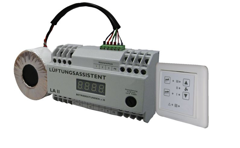 Anwendung • Mit dem Steuerungsset können 2 bis 8 Lüfter im Gegentakt-Betrieb gesteuert werden. • Die Steuerung ermöglicht die Be- und Entlüftung der Wohnung mit Wärmerückgewinnung oder alternativ die Querlüftung. Komfortmerkmale • Die Anlagensteuerung und -Überwachung erfolgt über eine Bedieneinheit, die alle Betriebsarten und relevanten Informationen anzeigt. Neben dem Wechsel der Betriebsart kann die Luftmenge über 5 Stufen ausgewählt und verschiedene Zeitprogramme hinterlegt werden. • Automatische Aufforderung zum Filterwechsel dank der integrierten Filter Überwachung. Effizienz • Die energiesparende Bedieneinheit mit LED-Anzeige sorgt für eine effiziente Betriebsweise. Installation • Der Montageplatz für das Leistungsteil und den Transformator befindet sich im Schaltschrank. • Für die Installation werden 12 Automatenplätze benötigt. • Die Bedieneinheit wird in einer Unterputzdose im Mauerwerk oder in einer Hohlwand montiert. • Die Geräte werden sternförmig vom Leistungsteil zu den Lüftern verdrahtet.