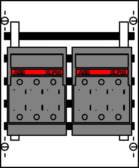 Innenausbausystem, Kombi-Sets, montiert auf EDF-Profil, für Sammelschienensystem mit Betriebsmittel, Rasteinheit 2 RE = 300 mm, Feldbreite 1 = 250 mm, 24 Platzeinheiten, bestückt mit 2 NH-Sicherungslasttrennschalter NH00, Betriebsmittel Fabrikat: ABB, ZH414, mit Sammelschienensystem 3-polig, Ausrichtung Sammelschienen: horizontal, mit Sammelschienenhalter ZB5, Sammelschienenmittenabstand: 40 mm, mit 3 Cu-Schienen, Bemessungsstrom In max. 360 A, Abdeckungen aus Kunststoff, 90 Grad Druck-Drehverschluss, RAL 7035, einsetzbar ab einer Schranktiefe von 200 mm, Kombi-Sets werden oben oder unten am Verteilerfeld eingesteckt und auf der anderen Seite am Schrank befestigt. Die EDF-Profilschienen und Feldverbinder sind im Lieferumfang enthalten.