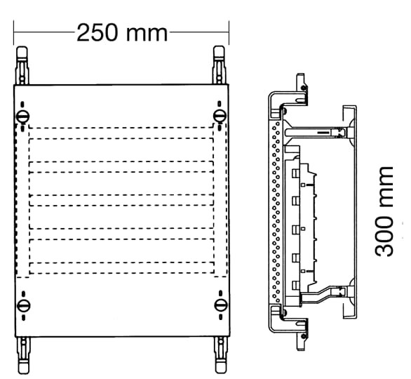 Innenausbausystem, Kombi-Sets, montiert auf EDF-Profil, für Sammelschienen, Rasteinheit 2 RE = 300 mm, Feldbreite 1 = 250 mm, 24 Platzeinheiten, mit Sammelschienensystem 5-polig, Ausrichtung Sammelschienen: horizontal, mit Sammelschienenhalter ZB5, Sammelschienenmittenabstand: 40 mm, mit 5 Cu-Schienen, Bemessungsstrom In max. 360 A, Abdeckungen aus Kunststoff, 90 Grad Druck-Drehverschluss, RAL 7035, einsetzbar ab einer Schranktiefe von 200 mm, Kombi-Sets werden oben oder unten am Verteilerfeld eingesteckt und auf der anderen Seite am Schrank befestigt. Die EDF-Profilschienen und Feldverbinder sind im Lieferumfang enthalten.