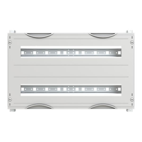 Innenausbau Modul, CombiLine, montiert im Schrank eingebaut, für SMISSLINE TP Geräteeinbau horizontal, Rasteinheit 2 RE = 300 mm, Feldbreite 2 = 500 mm, 48 Platzeinheiten, Reihenabstand: 150, Ausbau mit Hutprofilschiene 35 x 15 mm mit Lochung für Drahthalter, für Stecksockellänge 2 x 22 Platzeinheiten, Abdeckungen aus Kunststoff, 90 Grad Druck-Drehverschluss, RAL 7035, Ausführung der Abdeckung: mit Ausschnitt, einsetzbar ab einer Schranktiefe von 215 mm, EDF oder WR Montagegerüst muss separat bestellt werden