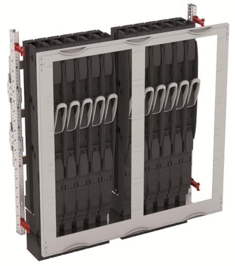 Innenausbau Modul, CombiLine, montiert im Schrank eingebaut, für Sammelschienensystem 185 mm NH-Lasttrennleisten, Rasteinheit 5 RE = 750 mm, Feldbreite 3 = 750 mm, 180 Platzeinheiten, nutzbare Breite von 600 mm, bestückt mit 6 NH-Sicherungslasttrennleisten NH1, Betriebsmittel Fabrikat: ABB, InLine II ZHBM, für Sammelschienensystem 3-polig, Ausrichtung Sammelschienen: horizontal, mit Sammelschienenhalter ZX522, Sammelschienenmittenabstand: 185 mm, für maximal 3 Cu-Schienen, (Sammelschienen müssen separat bestellt werden), Bemessungsstrom In max. 850 A, Abdeckungen aus Kunststoff, 90 Grad Druck-Drehverschluss, RAL 7035, Ausführung der Abdeckung: mit Ausschnitt, einsetzbar ab einer Schranktiefe von 275 mm, WR Montagegerüst muss separat bestellt werden