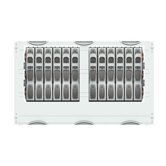 Innenausbau Modul, CombiLine, montiert im Schrank eingebaut, für Sammelschienensystem 100 mm NH00-Lasttrennleisten, Rasteinheit 3 RE = 450 mm, Feldbreite 3 = 750 mm, 108 Platzeinheiten, nutzbare Breite von 600 mm, bestückt mit 12 NH-Sicherungslasttrennleisten NH00, Betriebsmittel Fabrikat: ABB, InLine II ZLBM, für Sammelschienensystem 3-polig, Ausrichtung Sammelschienen: horizontal, mit Sammelschienenhalter ZX520, Sammelschienenmittenabstand: 100 mm, für maximal 3 Cu-Schienen, (Sammelschienen müssen separat bestellt werden), Bemessungsstrom In max. 850 A, Abdeckungen aus Kunststoff, 90 Grad Druck-Drehverschluss, RAL 7035, Ausführung der Abdeckung: mit Ausschnitt, einsetzbar ab einer Schranktiefe von 225 mm, WR Montagegerüst muss separat bestellt werden