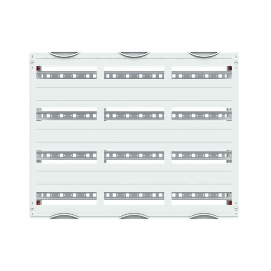 Innenausbau Modul, CombiLine, montiert im Schrank eingebaut, für DIN Reiheneinbaugeräte, Rasteinheit 4 RE = 600 mm, Feldbreite 3 = 750 mm, 144 Platzeinheiten, Reihenabstand: 150, Ausbau mit Hutprofilschiene 35 x 15 mm mit Lochung für Drahthalter, Hutschiene ab 3-feldbreit mit zusätzlicher Stabilisierungsschiene, für Einbaugeräte nach DIN 43880, Abdeckungen aus Kunststoff, 90 Grad Druck-Drehverschluss, RAL 7035, Ausführung der Abdeckung: mit Ausschnitt, einsetzbar ab einer Schranktiefe von 120 mm, EDF oder WR Montagegerüst muss separat bestellt werden