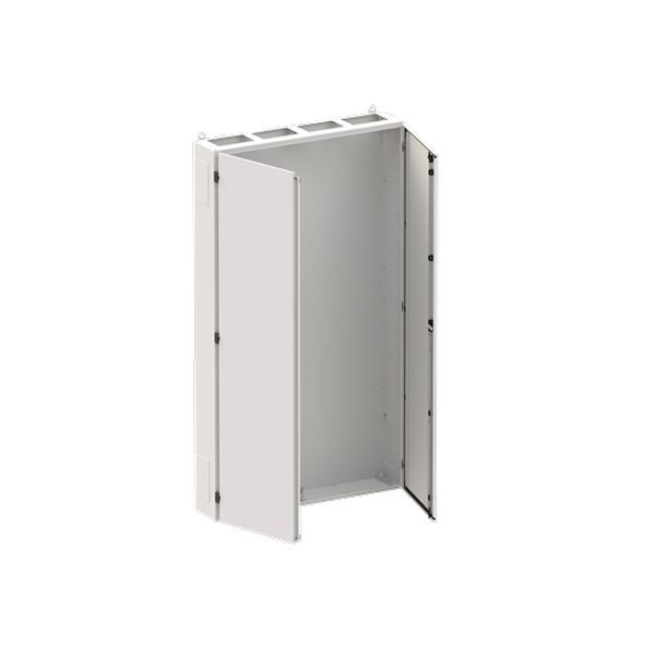 Standschrank, Baureihe TwinLine, Leerschrank, Montageart: Aufputz, teilversenkt, für den Innenbereich, mit Tür, Schutzklasse I (geerdet), Schutzart IP55, geltende Normen: DIN EN 61439-1, VDE 0660-600-1, DIN EN 61439-2, VDE 0660-600-2, DIN EN 61439-3, VDE 0660-600-3, IK-Code 08, pulverbeschichtet, in RAL 7035, Gehäuse aus Stahlblech, Doppeltür, Tür aus Stahlblech, mit Standardverschluss Doppelbart 3 mm, Türöffnungswinkel 180 Grad, Türanschlag rechts und links, Rückwand aus Stahlblech, Leitungseinführung oben über Flanschöffnung ausgeschnitten, unten über Flanschöffnung vorgeprägt, seitlich über Flanschöffnung vorgeprägt, Abmessungen in mm (H x B x T): 1850 x 1050 x 225, Rasteinheit 12 RE, Bauhöhe 8, Feldbreite 4, Platzeinheiten 576, vorbereitet für den Ausbau mit Zähler-, Verteilerfelder, Kombi-Sets, CombiLine-Module oder Montageplatten auf EDF-/WR-Montagegerüst