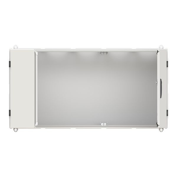 Wandschrank, Baureihe TwinLine, Leerschrank, Montageart: Aufputz, teilversenkt, für den Innenbereich, mit Tür, Schutzklasse I (geerdet), Schutzart IP55, geltende Normen: DIN EN 61439-1, VDE 0660-600-1, DIN EN 61439-2, VDE 0660-600-2, DIN EN 61439-3, VDE 0660-600-3, IK-Code 08, pulverbeschichtet, in RAL 7035, Gehäuse aus Stahlblech, Doppeltür, Tür aus Stahlblech, mit Standardverschluss Doppelbart 3 mm, Türöffnungswinkel 180 Grad, Türanschlag rechts und links, Rückwand aus Stahlblech, Leitungseinführung oben über Flanschöffnung ausgeschnitten, unten über Flanschöffnung vorgeprägt, seitlich über Flanschöffnung vorgeprägt, Abmessungen in mm (H x B x T): 650 x 1300 x 275, Rasteinheit 4 RE, Bauhöhe 0, Feldbreite 5, Platzeinheiten 240, vorbereitet für den Ausbau mit Zähler-, Verteilerfelder, Kombi-Sets, CombiLine-Module oder Montageplatten auf EDF-/WR-Montagegerüst