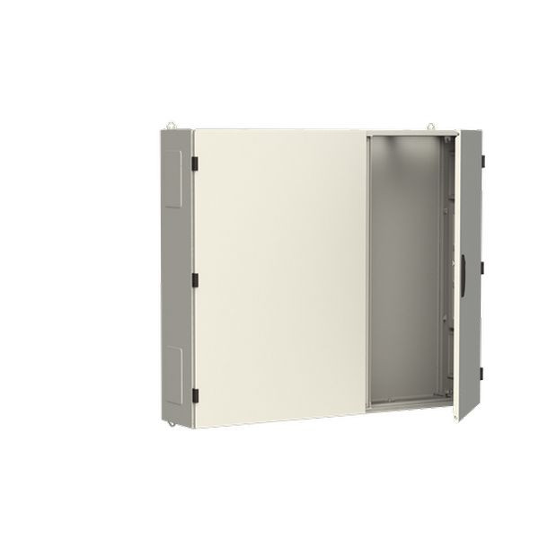 Wandschrank, Baureihe TwinLine, Leerschrank, Montageart: Aufputz, teilversenkt, für den Innenbereich, mit Tür, Schutzklasse II (schutzisoliert), Schutzart IP55, geltende Normen: DIN EN 61439-1, VDE 0660-600-1, DIN EN 61439-2, VDE 0660-600-2, DIN EN 61439-3, VDE 0660-600-3, IK-Code 08, pulverbeschichtet, in RAL 7035, Gehäuse aus Stahlblech, Doppeltür, Tür aus Stahlblech, mit Standardverschluss Doppelbart 3 mm, Türöffnungswinkel 180 Grad, Türanschlag rechts und links, Rückwand aus Stahlblech, Leitungseinführung oben über Flanschöffnung ausgeschnitten, unten über Flanschöffnung vorgeprägt, seitlich über Flanschöffnung vorgeprägt, Abmessungen in mm (H x B x T): 1100 x 1300 x 275, Rasteinheit 7 RE, Bauhöhe 3, Feldbreite 5, Platzeinheiten 420, vorbereitet für den Ausbau mit Zähler-, Verteilerfelder, Kombi-Sets, CombiLine-Module auf EDF-/WR-Montagegerüst