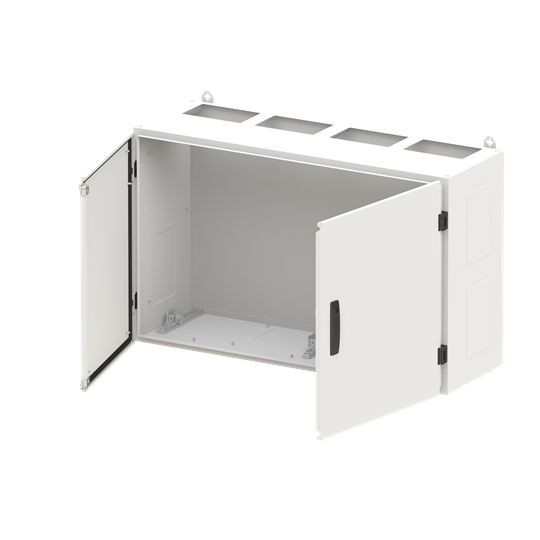 Wandschrank, Baureihe TwinLine, Leerschrank, Montageart: Aufputz, teilversenkt, für den Innenbereich, mit Tür, Schutzklasse I (geerdet), Schutzart IP55, geltende Normen: DIN EN 61439-1, VDE 0660-600-1, DIN EN 61439-2, VDE 0660-600-2, DIN EN 61439-3, VDE 0660-600-3, IK-Code 08, pulverbeschichtet, in RAL 7035, Gehäuse aus Stahlblech, Doppeltür, Tür aus Stahlblech, mit Standardverschluss Doppelbart 3 mm, Türöffnungswinkel 180 Grad, Türanschlag rechts und links, Rückwand aus Stahlblech, Leitungseinführung oben über Flanschöffnung ausgeschnitten, unten über Flanschöffnung vorgeprägt, seitlich über Flanschöffnung vorgeprägt, Abmessungen in mm (H x B x T): 650 x 1050 x 350, Rasteinheit 4 RE, Bauhöhe 0, Feldbreite 4, Platzeinheiten 192, vorbereitet für den Ausbau mit Zähler-, Verteilerfelder, Kombi-Sets, CombiLine-Module oder Montageplatten auf EDF-/WR-Montagegerüst