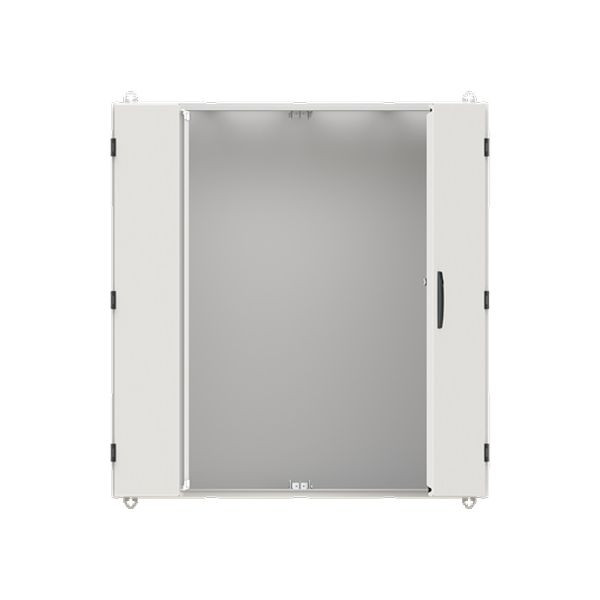 Wandschrank, Baureihe TwinLine, Leerschrank, Montageart: Aufputz, teilversenkt, für den Innenbereich, mit Tür, Schutzklasse II (schutzisoliert), Schutzart IP55, geltende Normen: DIN EN 61439-1, VDE 0660-600-1, DIN EN 61439-2, VDE 0660-600-2, DIN EN 61439-3, VDE 0660-600-3, IK-Code 08, pulverbeschichtet, in RAL 7035, Gehäuse aus Stahlblech, Doppeltür, Tür aus Stahlblech, mit Standardverschluss Doppelbart 3 mm, Türöffnungswinkel 180 Grad, Türanschlag rechts und links, Rückwand aus Stahlblech, Leitungseinführung oben über Flanschöffnung ausgeschnitten, unten über Flanschöffnung vorgeprägt, seitlich über Flanschöffnung vorgeprägt, Abmessungen in mm (H x B x T): 1100 x 1050 x 350, Rasteinheit 7 RE, Bauhöhe 3, Feldbreite 4, Platzeinheiten 336, vorbereitet für den Ausbau mit Zähler-, Verteilerfelder, Kombi-Sets, CombiLine-Module auf EDF-/WR-Montagegerüst