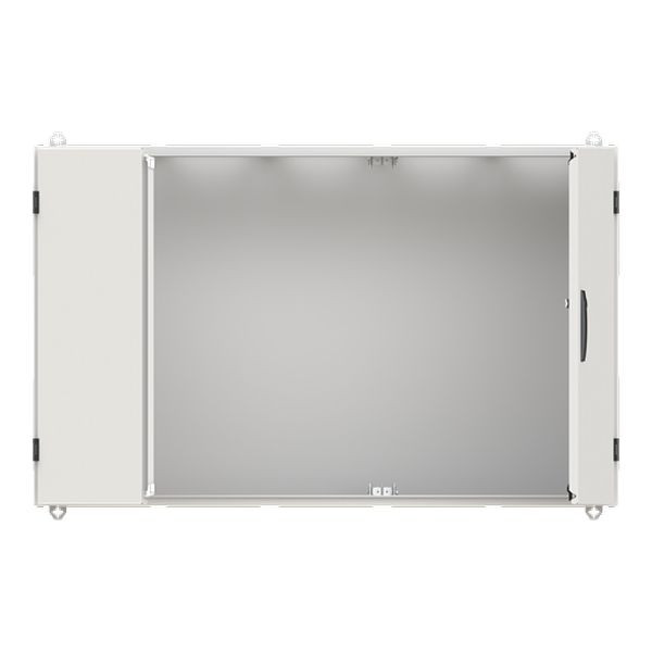 Wandschrank, Baureihe TwinLine, Leerschrank, Montageart: Aufputz, teilversenkt, für den Innenbereich, mit Tür, Schutzklasse II (schutzisoliert), Schutzart IP55, geltende Normen: DIN EN 61439-1, VDE 0660-600-1, DIN EN 61439-2, VDE 0660-600-2, DIN EN 61439-3, VDE 0660-600-3, IK-Code 08, pulverbeschichtet, in RAL 7035, Gehäuse aus Stahlblech, Doppeltür, Tür aus Stahlblech, mit Standardverschluss Doppelbart 3 mm, Türöffnungswinkel 180 Grad, Türanschlag rechts und links, Rückwand aus Stahlblech, Leitungseinführung oben über Flanschöffnung ausgeschnitten, unten über Flanschöffnung vorgeprägt, seitlich über Flanschöffnung vorgeprägt, Abmessungen in mm (H x B x T): 800 x 1300 x 350, Rasteinheit 5 RE, Bauhöhe 1, Feldbreite 5, Platzeinheiten 300, vorbereitet für den Ausbau mit Zähler-, Verteilerfelder, Kombi-Sets, CombiLine-Module auf EDF-/WR-Montagegerüst
