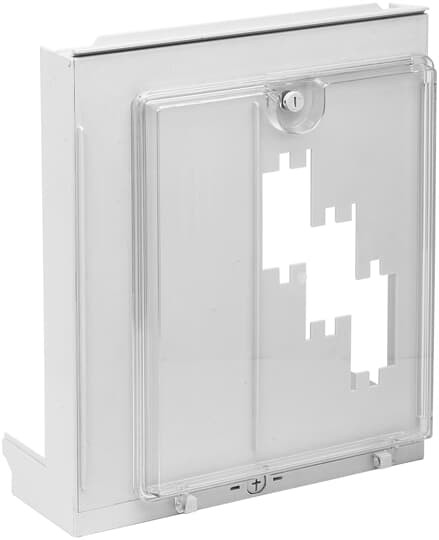 Abdeckung 300 x 250 mm, mit Plombierklappe 260 x 130 mm, mit Ausschnitt für 3 x NH00 und Vorprägung für 2 x NH00, für den unteren Anschlussraum im Zählerfeld plombierbar.