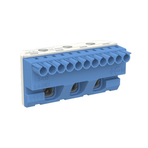 N Quick-Steckklemme für Quick-Steckträger, werkzeuglose Montage durch einfache Steck- und Rasttechnik, klare Farbcodierung: N = blau, flexibles Klemmensystem für mehrere N-Stromkreise, Anzahl der Klemmen: 11 x 1,5 - 4 mm² (Federklemmtechnik) + 3 x 2,5 bis 25 mm² (Schraubanschlusstechnik), Außenmaße H x B x T in mm: 32 x 65 x 31, einfaches Beschriften der Klemmenstellen (DIN VDE 0603 Teil 1) mit vorgedruckten, selbstklebenden Zahlenstreifen.