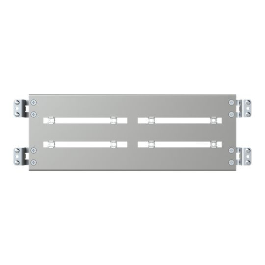 Montagetraverse für Trennerbefestigung, 2-feldbreit, für 2 Trenne NH1 oder NH2, Universalmontage auf Gleitschienentechnik zur Anpassung unterschiedlicher Befestigungsbohrungen, mit Befestigungsschrauben und Käfigmuttern M8, passend für M(B)T242(B), M(B)T243(B), M(B)T244(B), M(B)T245(B).
