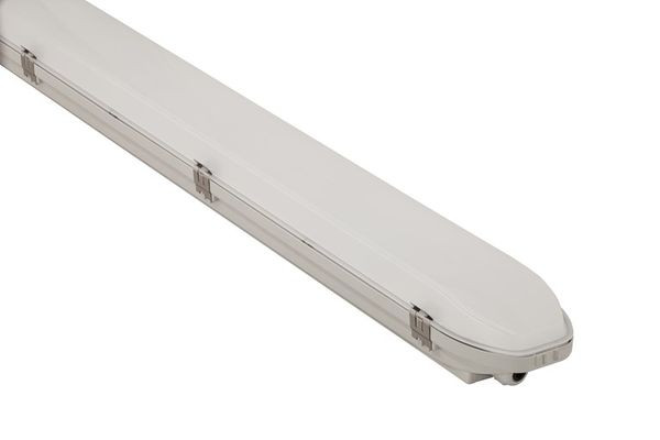 Resisto GRP, integrierte LED-Wetterschutzleuchte, mit glattem Gehäuse, optimiert für LEDs mit flachem Diffusor, einfach zu handhaben. Clips für den Diffusor und Befestigungsklammern aus Edelstahl für die Aufbaumontage. Die Leuchte verfügt über ein wasser- und staubdichtes GFK-Gehäuse und einen PMMA-Diffusor. 5200 lm; 37 W; 140 lm/W; 4.000 K; SDCM<4; nicht dimmbar; CRI80; IP66; IK02; Klasse I; 72.000 Stunden (L80B20) Lebensdauer; 1174 mm x 90 mm x 120 mm; D-Zeichen.