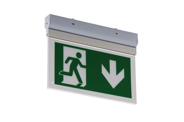 SylSafe Exit EX C EM3 MT MS ist ein oberflächenmontiertes Notausgangsschild. Drehbare Beschriftung für Wand-/Deckenmontageanwendungen. Wird mit einem ISO7010-konformen Beschriftungssatz geliefert. Pfeile links, rechts, oben, unten und ein leeres Blatt für einseitige Versionen. EC-Beschriftungssatz ist als Zubehör erhältlich. Erkennungsweite 26 m. Weiße Gehäusefarbe. Aufrechterhaltener 3-Stunden-Notbetrieb mit NiMH-Akku. Wiederaufladezeit 24 Stunden. Selbsttest mit DALI-Überwachungsfunktion. 2.2 W, IK03, IP20. Leistungsfaktor 0,6. Elektrische Konstruktion der Klasse II.