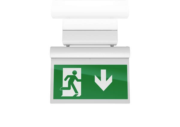 SylSafe Exit-Mod EX V EM3 MT MS ist ein deckenmontiertes Notausgangsschild. Wird mit einem ISO7010-konformen Legendenpaket geliefert. Pfeile links, rechts, oben, unten und ein leeres Blatt für einseitige Versionen. EC-Beschriftungssatz ist als Zubehör erhältlich. Erkennungsweite 26 m. Weiße Gehäusefarbe. Aufrechterhaltener 3-Stunden-Notbetrieb mit NiMH-Akku. Wiederaufladezeit 24 Stunden. 4,9 W, IK03, IP20. Leistungsfaktor 0,49. Elektrische Konstruktion der Klasse II.