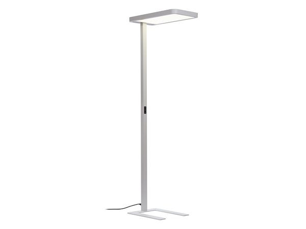 AREUM FLOOR 14KLM 4.000 K ALU ist eine hocheffiziente Stehleuchte, die optimale Beleuchtung für Einzel- und Doppelarbeitsplätze bietet. Ein Verhältnis von 75 % Uplight und 25 % Downlight sorgt für Umgebungs- und Arbeitsbeleuchtung mit einer einzigen Leuchte. Das direkte Licht wird durch einen mikroprismatischen PMMA-Diffusor für eine fortschrittliche Blendungsbegrenzung abgegeben. Das indirekte Licht wird durch einen transparenten Kunststoffdiffusor abgestrahlt. Leuchtenkörper aus weißem Aluminium RAL9006 pulverbeschichtet. Leuchtenkopf und Mast aus Aluminium für ein hochwertiges Erscheinungsbild. Standfuß aus Stahl für hohe Stabilität und platzsparende Positionierung mit Büromöbeln. Abmessungen der Leuchte: Kopf: 675x350x40 mm, Standfuß: 500x400x16 mm, Mast: 50x40x1.950 mm. Bedienung und Dimmung mit einem Druckknopf, der sich in der Stange befindet, in einer Höhe, die für höhenverstellbare Schreibtische geeignet ist. Up- und Downlight sind separat dimmbar. CRI (Ra)>80. 4.000 K (Neutralweiß) LED. Chromatizitätstoleranz: SDCM<3. Lichtstrom: 13.700 lm. Leistungsaufnahme 94 W. Systemeffizienz: 146 lm/W. Lebensdauer: L80B10 55.000 Stunden. UGR<16. Beleuchtungsstärke bei 65°<3.000 cd/m². IK02. IP20. Photobiologische Risikogruppe 0. Elektrische Schutzklasse I. Glühdrahtprüfung: 650 °C. Lieferung mit 2,5 m Kabel mit Stecker DIN 49441-R2.