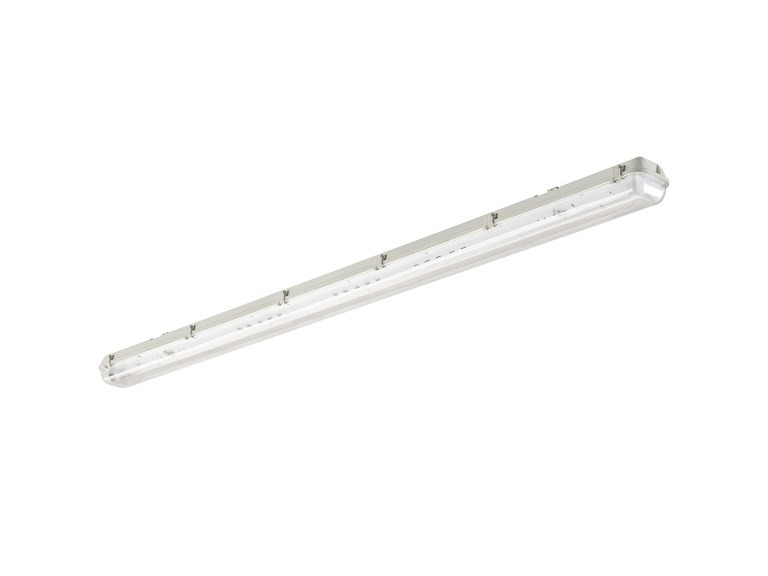 - Leuchte, Gehäuse aus Polycarbonat - Zwillingsausführung, 1500mm - Schutzart IP65 - Lichtstrom und Lichtfarbe variieren je nach verwendeten LED-Röhren - Zur Verwendung mit T8-LED-Röhren - Einfache Installation mit den mitgelieferten Befestigungswinkeln aus Edelstahl für die Deckenmontage - Ideal für alle Industrieanlagen, Garagen, Parkplätze, Werkstätten.