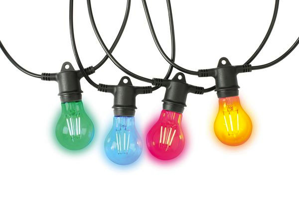 Eine Girlande für den Außenbereich mit 12 E27-Lampenfassungen, die mit ToLEDo Retro Chroma A60-Lampen verkauft wird. Hochwertige Gummikabel und kundenspezifisches Sylvania-Werkzeugdesign. Integrierte Aufhängehaken an jeder Lampenfassung. Durchverdrahtungsfunktion ermöglicht die Erweiterung auf bis zu 30 Ketten (bis zu 273 m). IP54 wasser-/staub-/schmutzabweisend. Unabhängig auf Qualität und Sicherheit geprüft (CE/UKCA). Zu den Anwendungen gehören: Gärten, Theater, Musikfestivals, Hotels und Kneipengartenbeleuchtung