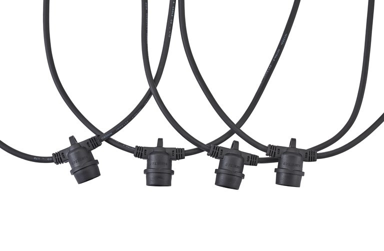 Eine Girlande für den Außenbereich mit 12 E27-Lampenfassungen. Hochwertige Gummikabel und kundenspezifisches Sylvania-Werkzeugdesign. Integrierte Aufhängehaken an jeder Lampenfassung. Durchverdrahtungsfunktion ermöglicht die Verlängerung auf bis zu 30 Ketten (bis zu 273 m). IP54-Wasser/ staub-/schmutzabweisend. Unabhängig auf Qualität und Sicherheit geprüft (CE/UKCA). Einsatzgebiete u. a.: Gärten, Theater, Musikfestivals, Hotels und Kneipengartenbeleuchtung.