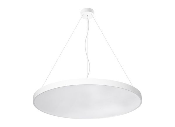 Runde architektonische Leuchte mit 1.200 mm Durchmesser, kann an der Oberfläche montiert oder abgependelt werden. Pulverbeschichtetes Aluminiumgehäuse (RAL9016) mit opalem Polycarbonat-Diffusor. Direkt strahlend, 20.975 lm Lichtstrom, 153,6 W Systemleistung, 137 lm/W Leuchteneffizienz. DALI-dimmbar. Farbwiedergabeindex Ra >80, 3.000 K warmweiße LED, Chromatizitätstoleranz der 3-stufigen MacAdam-Ellipse. IP40/IP20, IK03. 450 mA Stromstärke. Elektrische Schutzklasse 1, 220-240 V. Lebensdauer 66.000 Stunden L90B10.