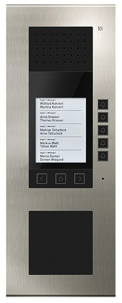 BCM Außenstation mit Display zur Aufputzmontage mit Ruftasten. Als automatisch verwaltete TCS:BUS Display Außenstation ist die AD5-Reihe Bestandteil des BCM-Systems. Die zentrale Verwaltung nutzt die WEB-basierte Benutzeroberfläche des BCM-Systems (Anwendungsmanager) und gewährleistet im Falle eines Gerätetausches die Aktualität von Bewohnerdaten und Seriennummern. Das BCM-System kann dynamisch an Erfordernisse angepasst werden - und das über nahezu beliebige Standorte. Das Benutzerinterface der AD5 besteht aus fünf digital beschrifteten Klingeltasten. Die Außenstation verfügt über ein vollgrafisches, monochromes Display mit einer Auflösung con H298 x V384 Pixeln. Weißes Backlight im Display garantiert Lesbarkeit unter allen Licht- und Temperaturverhältnissen. Icons unterstützen die Benutzerführung. Fünf Namen-Datensätze werden immer gleichzeitig angezeigt, wobei jeder Namen-Datensatz aus einer Infozeile und zwei Namen-Textzeilen zur Beschriftung besteht. Es können maximal 30 Namen-Datensätze gespeichert werden. Die Navigation durch die Namen-Datensätze erfolgt in Schritten zu je 5 Namen-Datensätzen mit drei Tasten (ZURÜCK, HOME, VOR). Über MODBUS wird die Außenstation an das BCM-System angekoppelt. Der StartBildschirm kann benutzerdefiniert angepasst werden. Technische Daten: Halbschalengehäuse aus Edelstahl mit innenliegendem Funktionsmodul aus schwarz eloxiertem Aluminium. Maße: H 375,5 x B 140 x T 25 mm.