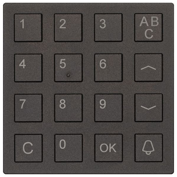 Tastaturmodul für Außenstationen in individualisierter Bestückung, Unterputzmontage, hinter 3 mm Frontblenden integrierbar, frontbündiger Einbau für Frontblenden von 1,5 mm bis 2,5 mm durch beiliegende Distanzplatten, sichtbare Frontabmessung 82 mm x 82 mm (Ausschnitt), Modulrasterabstand 120 mm, zum Anschluss an Displaymodul, 16er Tastatur zur Auswahl des Namens bzw. des Rufzieles und zur Nutzung der Codeschlossfunktion (Anzahl der Codes: 3), Maße: H 105 x B 105 x T 15, Material: Aluminium, eloxiert schwarz