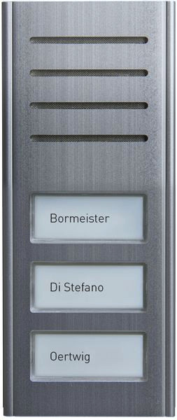 Außenstation in kompakter Bauweise zur Aufputzmontage, Metallgehäuse aus robustem Aluminiumvollmaterial, Eloxiert Natur, Beleuchtete Kunststoff-klingelknöpfe mit intergriertem Namenschild, wartungsfreien Kontakten, langlebige und energiesparende Namensschildbeleuchtung, Quittungston beim Drücken der Klingeltaste, Gesprächszeit ab Werk: 56 Sekunden, Lautstärke und Mikrofonempfindlichkeit sind manuell einstellbar, R-Klemme nicht vorgesehen, Programmierkontakte ohne Geräteöffnung erreichbar, Türbereitschaftszeit (zur Steuerung der Kurzzeitspeicherung in Innenstationen), ab Werk: 56 Sekunden, Sprechverbindung nur möglich in der Türbereitschaftszeit, basiert auf dem TCS-BUS in 3-Draht-Technik, zulässige Umgebungstemperatur: -20 Grad C bis 50 Grad C, IP42, Gehäusemaß: H: 139mm x B: 50mm x T: 16mm