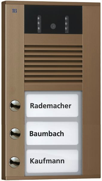 für 3 Wohneinheiten, Kamerafeld: H 38 mm x B 82 mm, color-Kamera CMOS-Sensor 380 TVL, IR-Beleuchtung für Nahfeldausleuchtung, automatische Tag / Nachtumschaltung, Brennweite: f = 2,0 mm (F2,5), Lichtempfindlichkeit 0 Lux (IR ON), 1 Lux (IR OFF), diagonaler Erfassungswinkel in 130 Grad, empfohlene Montagehöhe für die Kameraposition 1,6 m, Videoausgang symmetrisch 1 Vss FBAS, basiert auf dem TCS-Videosystem in 6-Draht-Technik, Eingangsstrom: I(a) = 0,4 mA, I(P) = 60 mA in Ruhe, maximaler Eingangsstrom: I(Pmax) = 80 mA, zulässige Umgebungstemperatur: -20 Grad C bis 50 Grad C, Farbe: Aluminium eloxiert bronze, Maße: H 242 mm x B 135 mm x T 20 mm