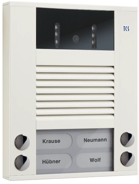 für 4 Wohneinheiten, Kamerafeld: H 38 mm x B 82 mm, color-Kamera CMOS-Sensor 380 TVL, IR-Beleuchtung für Nahfeldausleuchtung, automatische Tag / Nachtumschaltung, Brennweite: f = 2,0 mm (F2,5), Lichtempfindlichkeit 0 Lux (IR ON), 1 Lux (IR OFF), diagonaler Erfassungswinkel in 130 Grad, empfohlene Montagehöhe für die Kameraposition 1,6 m, Videoausgang symmetrisch 1 Vss FBAS, basiert auf dem TCS-Videosystem in 6-Draht-Technik, Eingangsstrom: I(a) = 0,4 mA, I(P) = 60 mA in Ruhe, maximaler Eingangsstrom: I(Pmax) = 80 mA, zulässige Umgebungstemperatur: -20 Grad C bis 50 Grad C, Farbe: Aluminium weiß pulverbeschichtet (WS), Maße: H 166 mm x B 135 mm x T 20 mm